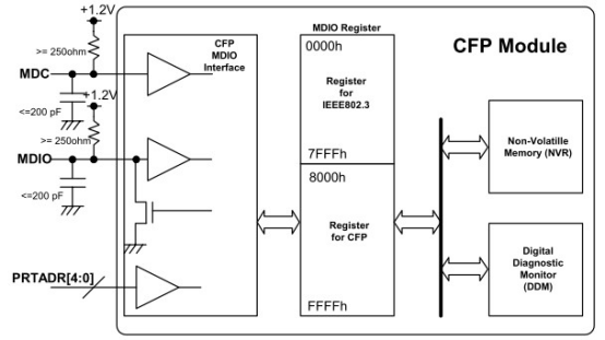 CFP transceivers supports the MDIO interface specified in IEEE802.3 Clause 45. This 2-wire management data I/O interface is provided for the module status monitoring and control. The management data clock (MDC) provides clocking for the data that is passed on the MDIO port. Five further pins allow for loading of a port address (PORT_ADDR0-4) into the module.